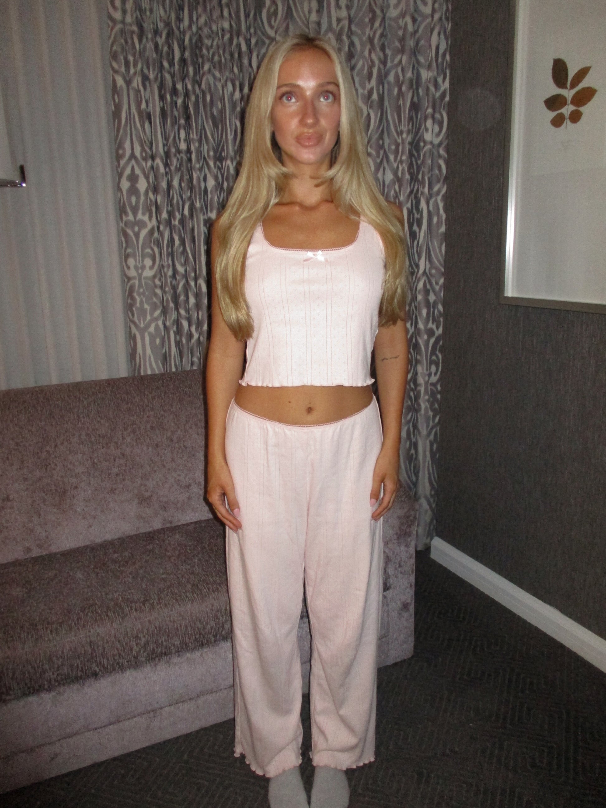 Soft, sweet, and endlessly wearable. The Pointelle Set in Ballet Pink pairs a barely-cropped tank with relaxed, easy-fit pants — all crafted from 100% cotton pointelle for that lightweight, airy, lived-in feel. Finished with delicate trim and a dainty ribbon bow, it’s made for cozy mornings, quiet moments, and every soft daydream in between.